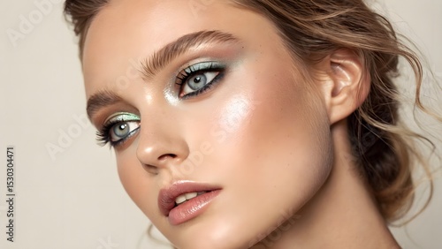 Stunning close‑up of a face with holographic eye makeup under soft lighting—subtle yet futuristic beauty concept.