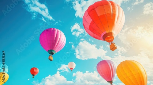 Stunning colorful balloons soaring through the sky on a clear, sunny day, with a realistic blue sky and soft white clouds in the background
