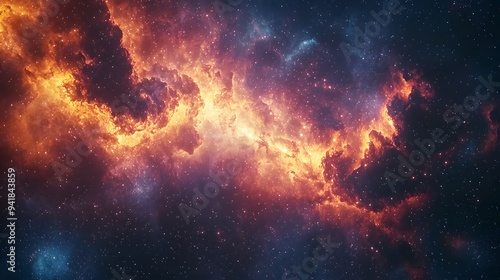 Stunning cosmic clouds illuminated by fiery hues of orange and purple.