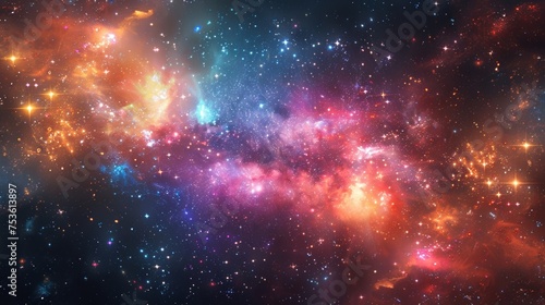Stunning cosmic display of a galaxy cluster, showcasing the vibrant hues of various stars and the gravitational dance between celestial bodies.
