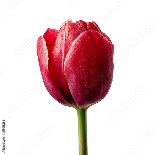 tulip, red tulip, flower, bloom, blossom, plant, botanical, closeup, spring, floral, dew-drop, water droplets, single flower, vibrant, colours, red, crimson, beautiful, elegant, fresh, high-coloured, detailed, texture, white background, studio shot, spring flower, garden, closeup, macro, isolated, background, floral pattern, nature, beauty