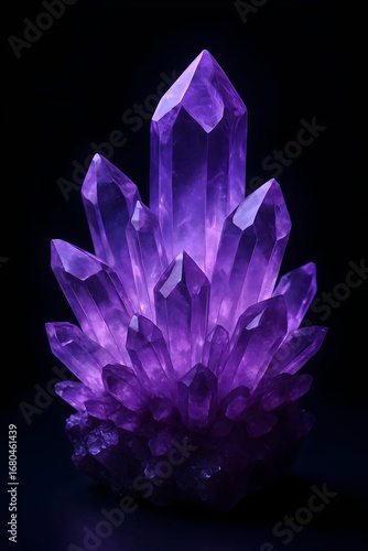 Stunning deep purple amethyst crystal cluster glowing with ethereal light against a dark background, captivating natural beauty