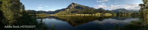 Stunning hdr panorama of serene lake and mountain reflection nature landscape