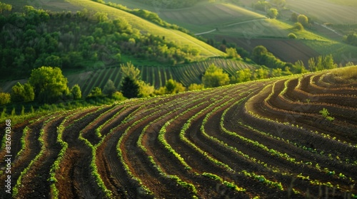 agriculture, sunset, farming, landscape, golden light, beauty, precision, rural, cultivation, nature, scenic, picturesque, dirtied, sustainable, environmentally friendly, green, lush, panoramic, environmental, hillside, fertile, growth, earth, efficiency, vibrant, serene, tranquil, sustainability