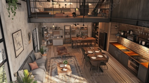 loft, apartment, interior, design, open, plan, living, industrial, chic, modern, home, decor, style, space, architecture, room, house, kitchen, dining, living room, furniture, lighting, wooden, floor, brick, wall, cosy, comfortable, stylish, elegant, luxury, contemporary, rustic, vintage, metropolitan, urban, aesthetic, atmosphere, sunlight, window, plant