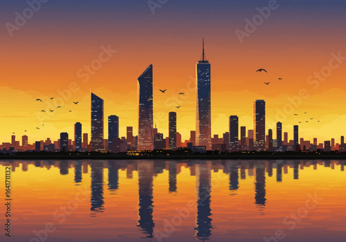 Stunning modern city skyline bathed in warm sunset glow with reflective water and soaring birds creating a vibrant, aspirational atmosphere for business and travel.