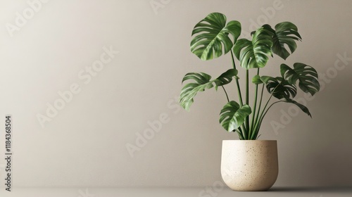 Stunning Monstera Deliciosa: A Photorealistic Botanical Photography of a Tropical Houseplant in a Chic Beige Ceramic Pot with Lush Green Foliage