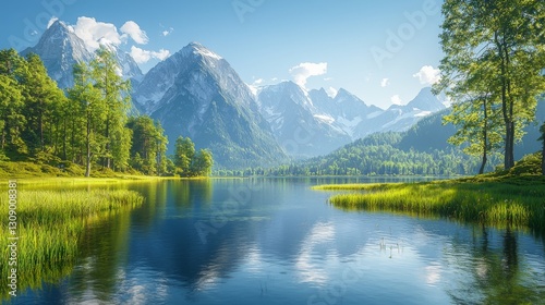 Stunning Mountain Meadows with Majestic Peaks and Serene Waters Under Clear Blue Sky