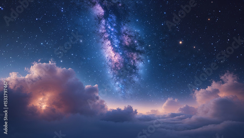 Stunning night sky scene with the milky way galaxy above the clouds and stars