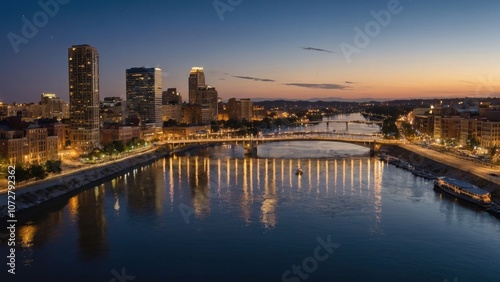 skyline, river, evening, reflections, city lights, city landscape, bridge, waterfront, architecture, calmness, summer, dusk, nature, bright, illumination, city life, travel, tour tourism, scenic, peaceful, downtown, night photography, riverside, panoramic view