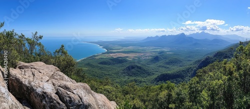 Stunning panoramic landscape view from a high vantage point overlooking lush green hills and a serene coastal line under a bright blue sky