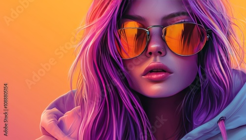 Stunning portrait of a girl with purple hair in sunglasses and hoodie against a gradient background