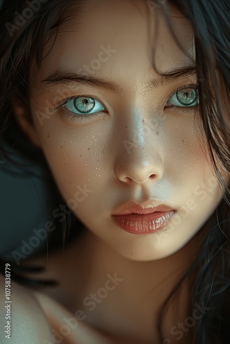 portrait, beautiful, girl, green eye, closeup, soft light, hi-res, serene, thoughtful, gaze, intimate, facial features, natural beauty, elegant, eye contact, peaceful, contemplative, youth, softness, woman, face, hair, fashion, skin, model, person, brunette, smile, lip, make-up, lady, head, looking, sensuality, glamour, serious