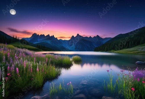 stunning scenic landscape showcasing luminous moonrise over majestic mountains serene waters, sky, night, scenery, reflection, cloud, light, beauty, horizon