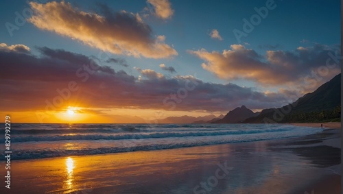 Stunning serene beach with colorful sunrise and mountain backdrop