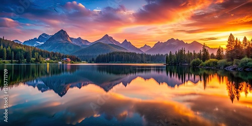 Stunning Silhouette of Strbske Pleso Lake in Alpine Mountains, Slovakia - Breathtaking Nature Landscape, Scenic Reflection, Majestic Peaks, Tranquil Waters, European Wilderness