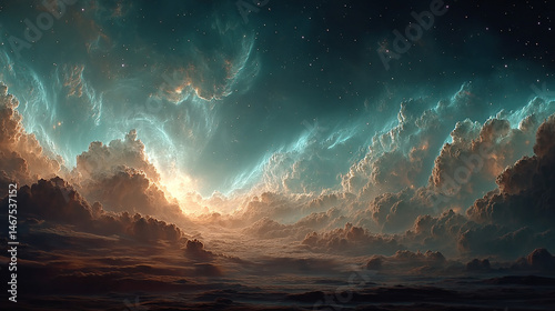 Stunning space scene of colorful nebulae like auroras rippling across the cosmos. Symbolizes mystery, cosmic energy, life beyond Earth, and the harmony of celestial forces in a vibrant universe.
