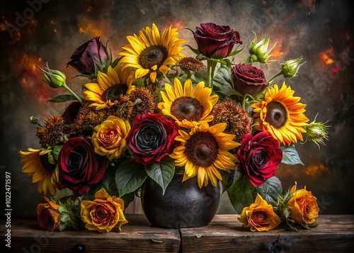 Stunning Summer Gothic Bouquet of Sunflowers and Roses for Festive Holiday Decor
