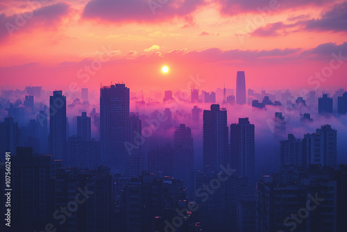 sunset, city skyline, pink sky, city landscape, building, mist, evening light, scenery, nature, atmospheric, tranquil, dusk, metropolis, silhouette, cloud, view, sunlight, horizon, serene, city landscape, panoramic, colorful sky, architecture, natural beauty, peaceful, calmness