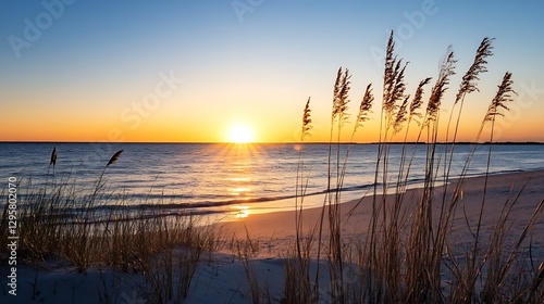 Stunning Sunset Over Beach with Silhouetted Grass on Sandy Shoreline : Generative AI