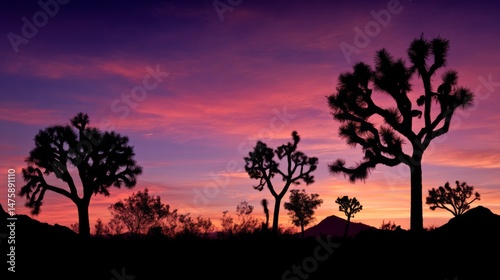 Stunning Sunset Over Joshua Trees with Vibrant Purple and Orange Sky in Desert Landscape