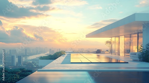 Stunning sunset over modern rooftop pool in urban landscape serene view