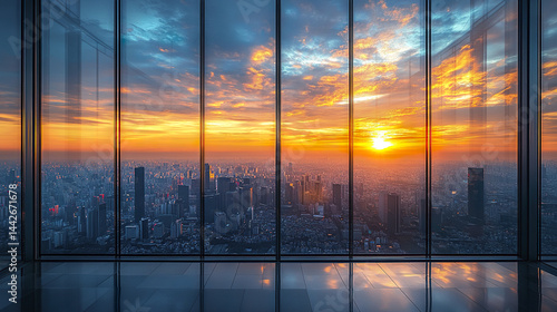 stunning sunset view from sleek glass building, showcasing vibrant city skyline