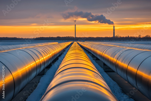 pipeline, pipeline, sunset, sunrise, industry, industrial, factory, smokestack, smokestack, energy, power, transport, transportation, metal, steel, tube, pipe, winter, snow, landscape, horizon, dusk, dawn, golden hour, infrastructure, technology, environmental, environment, nature, background, texture, pattern, construction, engineering, business, commerce, production, supply, resource, global, international, fuel, oil, gas, electricity, power plant, industrial plant, cold