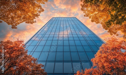 architecture, building, city, fall, autumn, leaf, nature, urban, skyline, glasses, modern, seasonal, tree, foliage, sunset, bright, colourful, perspective, abstract, design, geometry, structure, cloud, beautiful, environment, scenery, sunlight, growth, warmth, atmosphere, tour tourism, travel, vibrant, season, contrast, light, blue, orange, yellow, square, urban life, calmness, habitat