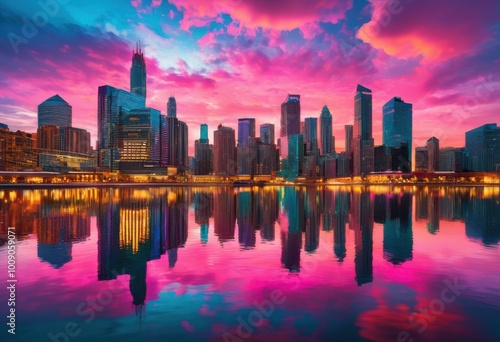 stunning vibrant cityscapes dusk brilliant reflections creating luminous urban landscape, skyline, buildings, evening, architecture, horizon, water, glow