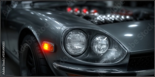 Stunning view of a classic silver sports car with a bright orange indicator light.