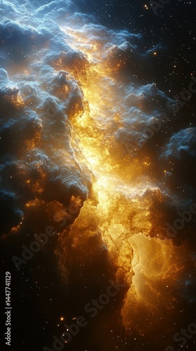 Stunning view of a cosmic gas nebula illuminated by bright golden hues in the universe's vast expanse