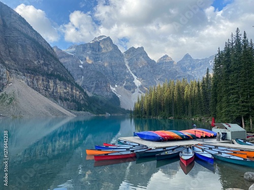 Stunning view of the Moraine Lake canoe dock, where colorful canoes rest on the turquoise waters