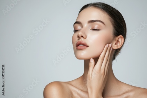 Stunning woman with flawless skin touching her neck isolated on grey background.