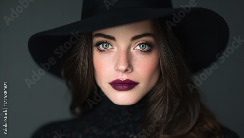 Stunning woman with striking green eyes and bold plum lipstick, wearing an elegant black wide-brimmed hat, exuding confidence and mystery in a studio portrait.