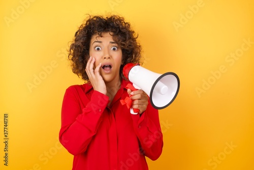 Stupefied Young arab woman with curly hair wearing red shirt holding a megaphone on yellow background expresses excitement and thrill, keeps jaw dropped, hands on cheeks, has eyes popped out,