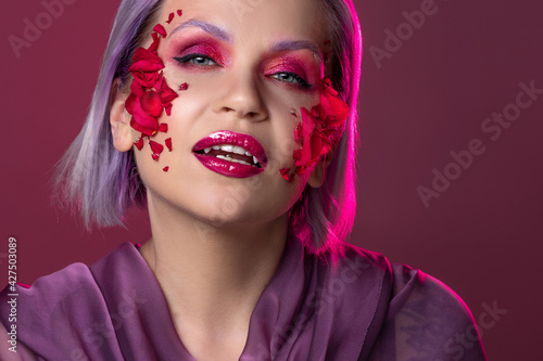 flower, flower petals, bloom, skin, bright, creative, brightness, crimson, scarlet, magenta, pink, purple, mauve, face, glamour, beauty, woman, young, stylish, bold, make-up, cosmetic, unusual, design, art, colours, lip, lipstick, many-coloured, shine, colourful, closeup, female, fashion, sexy, make-up, model, beautiful, hair, coiffure