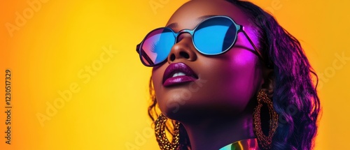 Stylish Black woman with sunglasses and purple lipstick looking up against vibrant yellow and purple background Concept of fashion, beauty, and confidence