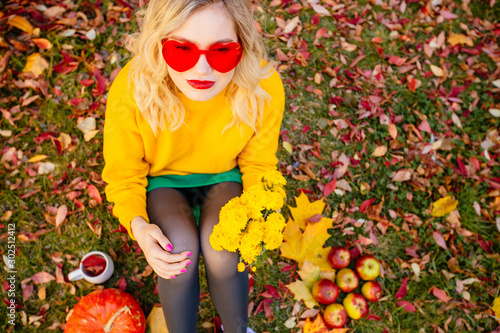 Stylish blond hipster woman wearing yellow knitted sweater, heart shaped sunglasses sitting on grass on autumn colorful bright background, people vivid lifestyle, relax vacation concept
