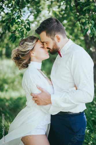 stylish bride and groom in the garden. a groom with a beard. fan art. rustic style