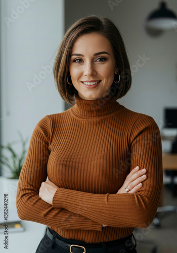 Stylish Caucasian businesswoman in her 40s, radiating poise in a bright office portrait.