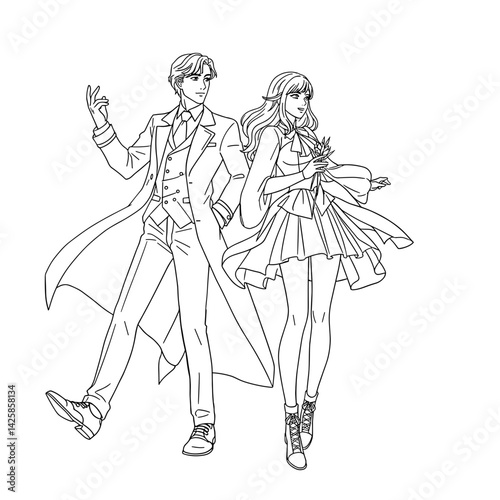 couple, confident, posing, outline, fashionable, elegant, contemporary, art, friendship, attire, creativity, design, modern, stylish, group, interaction, male, female, expression, youth, character, people, joy, emotion, minimalism, black-and-white, artsy, whimsical, love, togetherness, fashion, youthfulness, charme, casual attire, sophisticated, outlined, happiness, artistic, illustration, engaged, joyous, monochrome