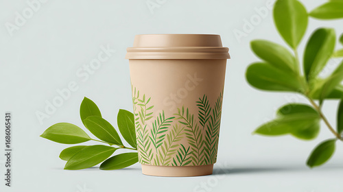 Stylish Cup Design Featuring Green Botanical Patterns Set Against a Soft Backdrop With Leaves