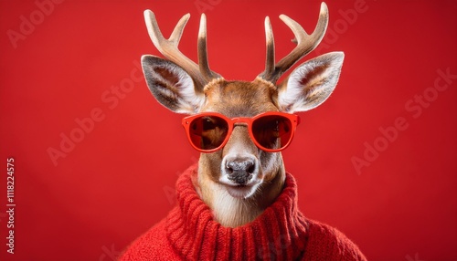 Stylish deer wearing red sunglasses and a cozy sweater against a bright red background, showcasing a fun and playful concept perfect for festive themes and wildlife illustrations
