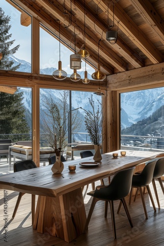 Stylish dining room in a luxury chalet with panoramic mountain views