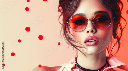 Stylish Fashion Model Wearing Trendy Sunglasses and Accessories in Artistic Portrait with Vibrant Red Dots, Modern Beauty Concept, Fashion Photography, Chic and Confident Mood, Daytime Setting
