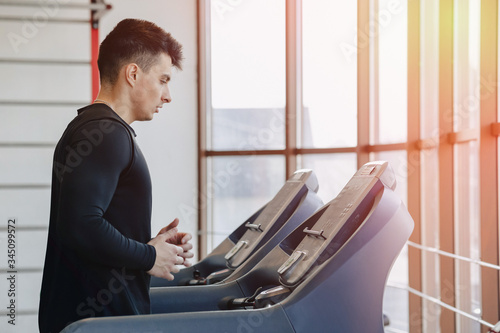 stylish guy in the gym is training on the treadmill. Healthy Lifestyle.
