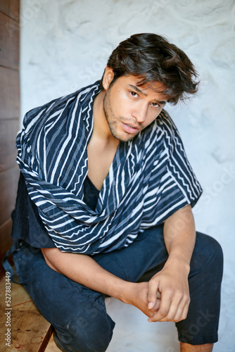 model, style, fashion, masculine, macho, ornament, house, man, portrait, foulard, unshaved, rest, hispanic, haircut, stylish, wooden, wall, rough, uneven, home, blue, colours, ethnic, male, natural, material, sincere, gaze, modern, outfit, contemporary, idylli, trendy, apparel, to sit, garment, domestic, casual attire, beard, daytime, young, indoor