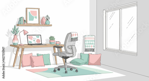 office, home, desk, workspace, interior, design, modern, furniture, chair, laptop, room, decor, comfortable, work, space, style, creative, freelance, remote, business, apartment, lifestyle, minimalist, pastel, colours, plant, window, light, cosy, ergonomic, setup, workplace, indoor, residence, nobody, quiet, serene, calm, peaceful, balance, harmony, inspiration, productive, contemporary, elegant, artistic, simple, decoration, drawing