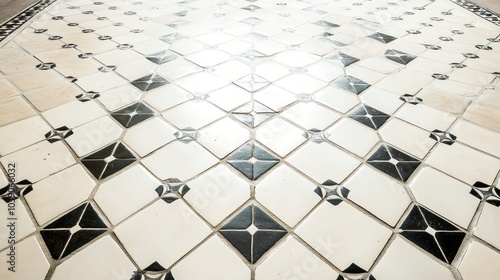 floor, light, beige, black, patterned, tile, diamond, design, elegant, stylish, sophisticated, unique, shape, interior, decor, home, flooring, artistry, contemporary, aesthetic, renovation, architecture, visual, creativity, texture, style, ambience, modern, chic, motif, geometric, beautiful, attractive, quality, material, craftsmanship, concept